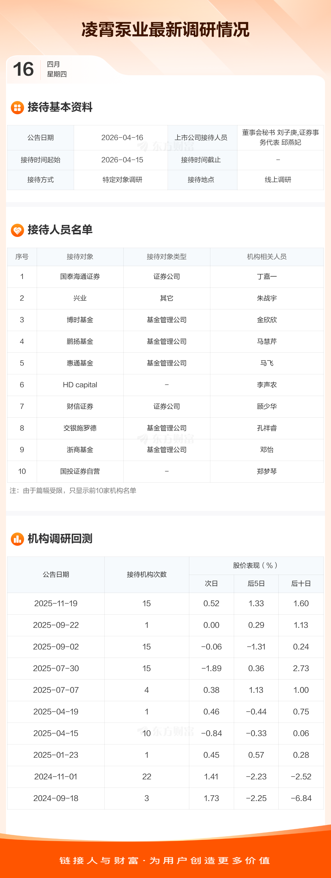 凌霄泵业4月16日公告称,4月15日接待国泰海通证券等18家机构调研。接待人员包括董事会秘书 刘子庚,证券事务代表 邱燕妃。
