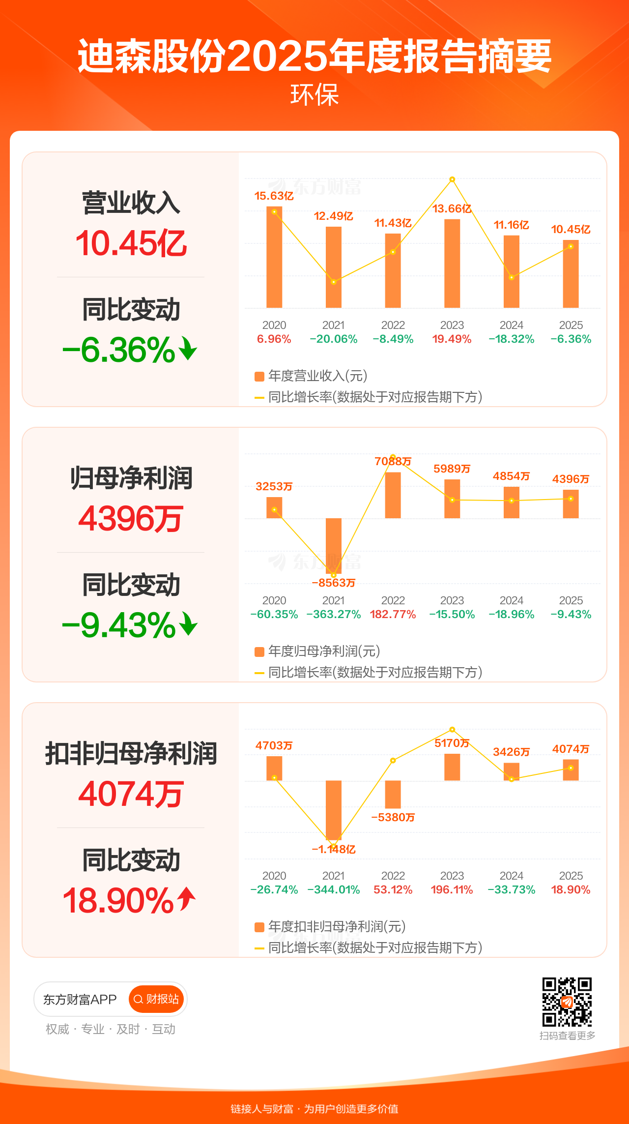 迪森股份4月17日发布2025年年报显示,公司全年实现营业收入10.45亿元,同比下滑6.36%;归母净利润4396.04万元,同比下滑9.43%;扣非归母净利润4074.15万元,同比增长18.90%。