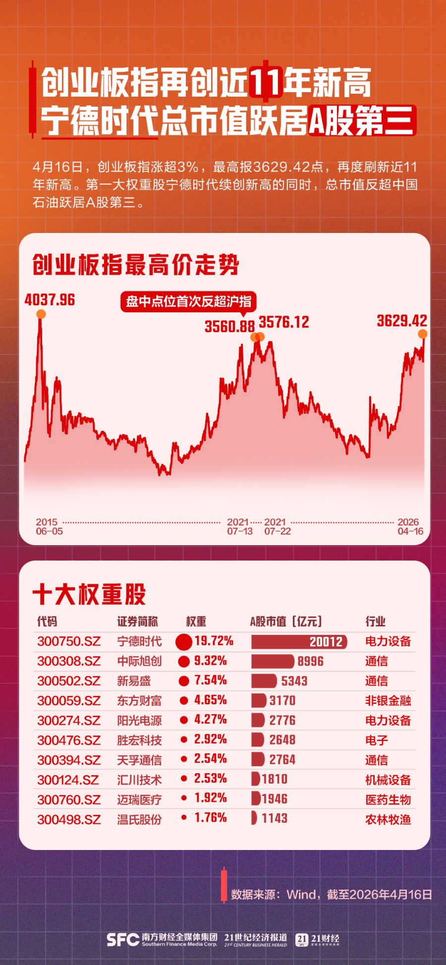 4月16日,创业板指涨超3%,最高报3629.42点,再度刷新近11年新高。第一大权重股宁德时代续创新高的同时,总市值反超中国石油跃居A股第三。