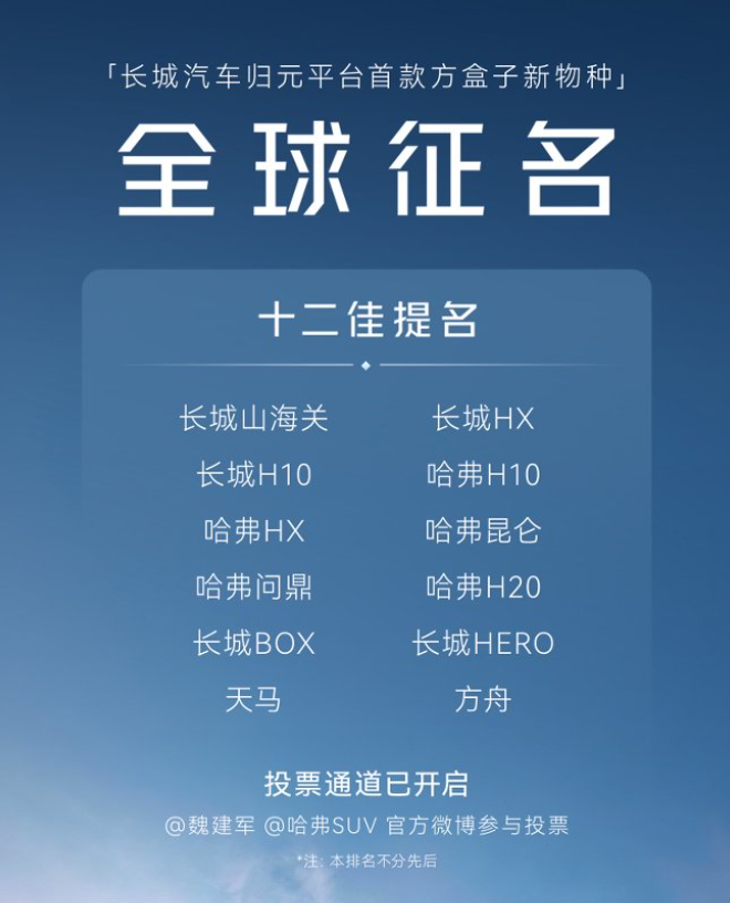 将时间的指针回拨,此次新车命名从一开始就设定了清晰的路径:要面向全网公开征集,坚持用户共创。4月10日,官方从近30万条网友留言中筛选出候选名称,随即在魏建军微博开启全民投票,哈弗也同步推出有奖互动,用户参与热情持续走高。