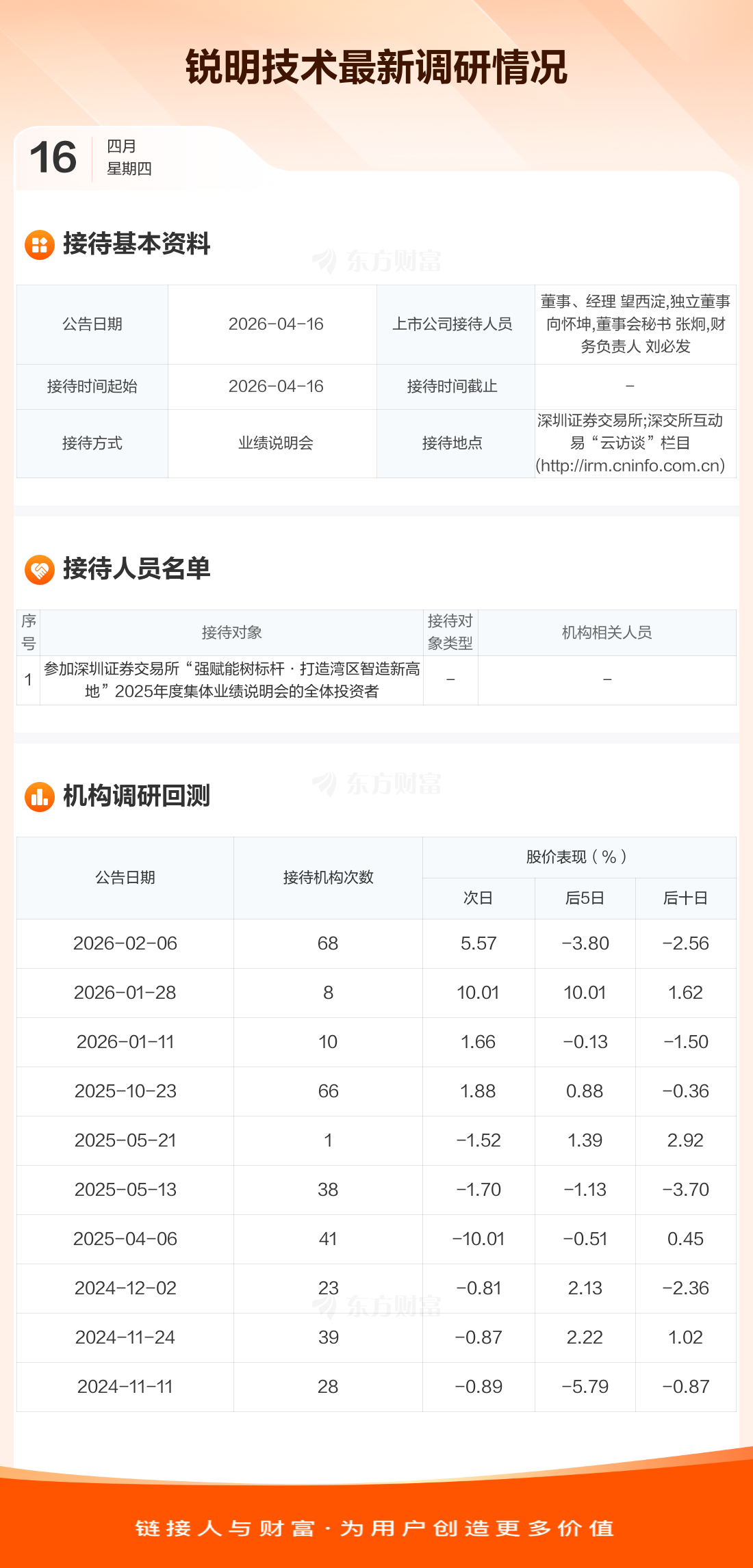锐明技术4月16日公告称,4月16日接待参加深圳证券交易所“强赋能树标杆·打造湾区智造新高地”2025年度集体业绩说明会的全体投资者调研。接待人员包括董事、经理 望西淀,独立董事 向怀坤,董事会秘书 张炯,财务负责人 刘必发。