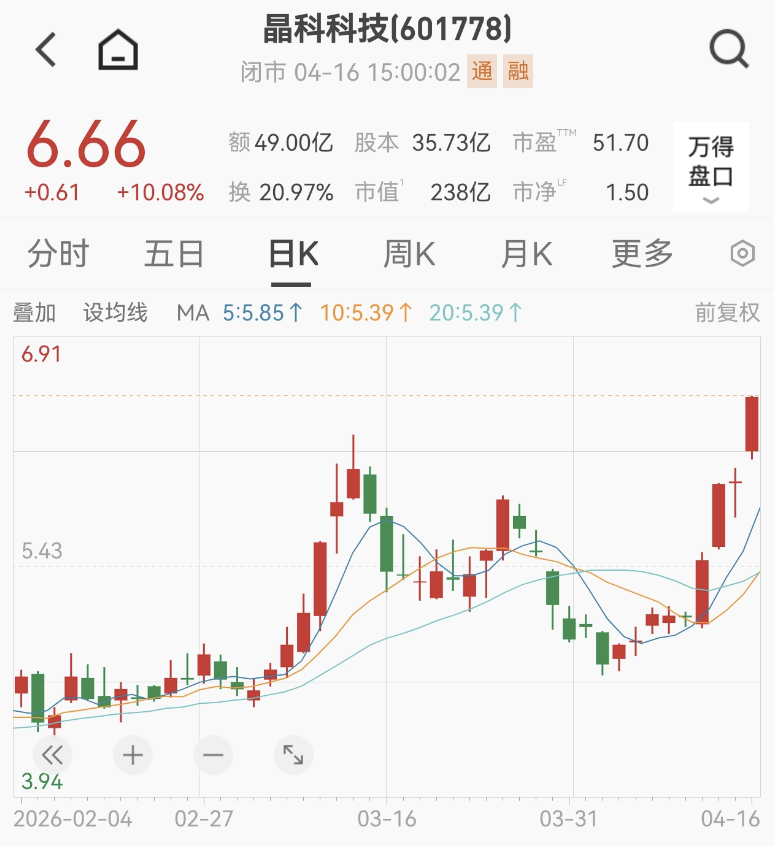 今年以来,受益于光伏行业景气度修复、特斯拉拟采购中国光伏设备等利好消息,晶科科技股价持续走强。4月16日,晶科科技收于6.66元/股,涨幅为10.08%,走出“3天2板”;当前总市值为238亿元,年内涨幅达79%。