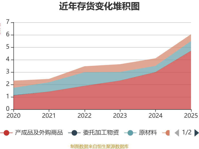 从存货变动来看,截至2025年末,公司存货账面价值为6.04亿元,占净资产的39.09%,较上年末增加1.94亿元。其中,存货跌价准备为105.95万元,计提比例为0.18%。
