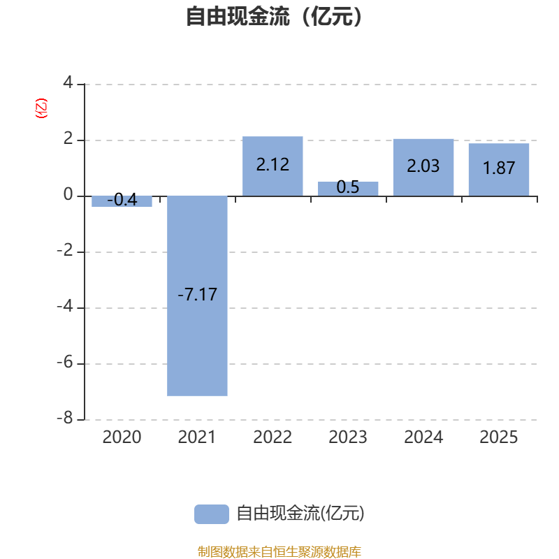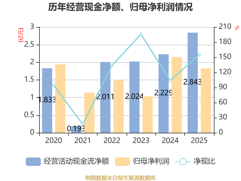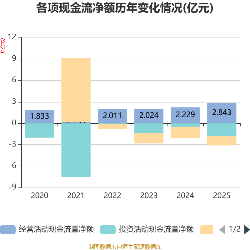 截至2025年,公司经营活动现金流净额为2.84亿元,同比增长27.51%;筹资活动现金流净额-1.29亿元,同比增加2956.8万元;投资活动现金流净额-1.82亿元,上年同期为-5004.44万元。