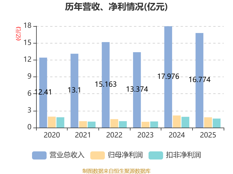 中证智能财讯依依股份(001206)4月17日披露2025年年度报告。2025年,公司实现营业总收入16.77亿元,同比下降6.69%;归母净利润1.83亿元,同比下降14.92%;扣非净利润1.6亿元,同比下降16.25%;经营活动产生的现金流量净额为2.84亿元,同比增长27.51%;报告期内,依依股份基本每股收益为1.00元,加权平均净资产收益率为9.79%。公司2025年度分配预案为:拟向全体股东每10股派现3元(含税)。