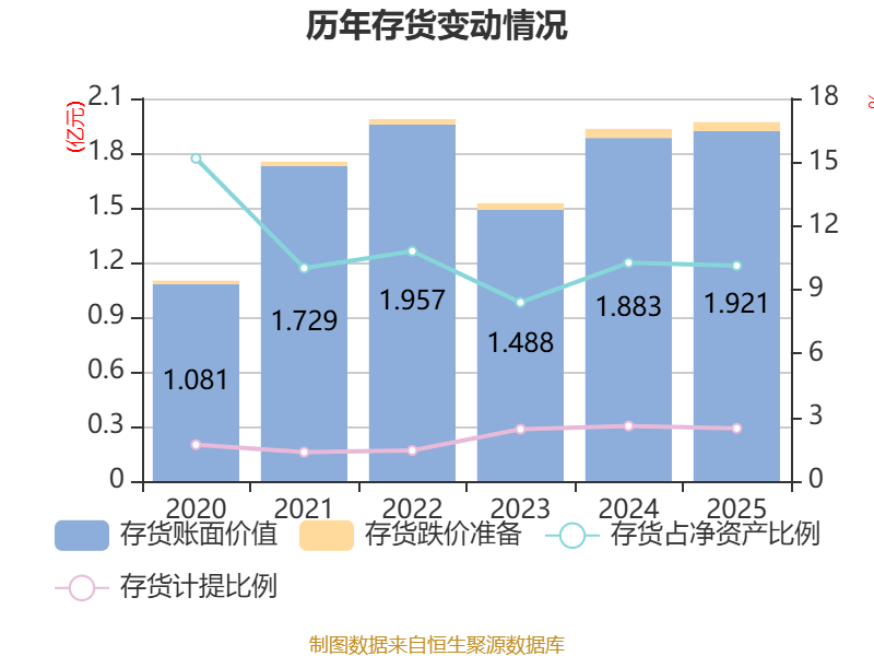 从存货变动来看,截至2025年末,公司存货账面价值为1.92亿元,占净资产的10.13%,较上年末增加372.59万元。其中,存货跌价准备为488.79万元,计提比例为2.48%。