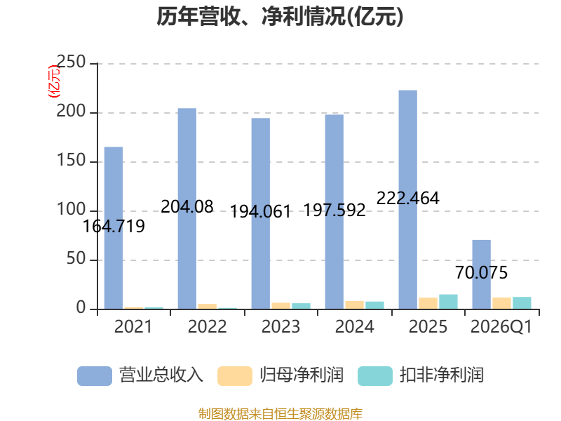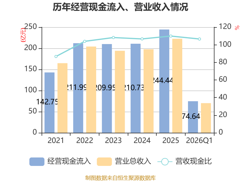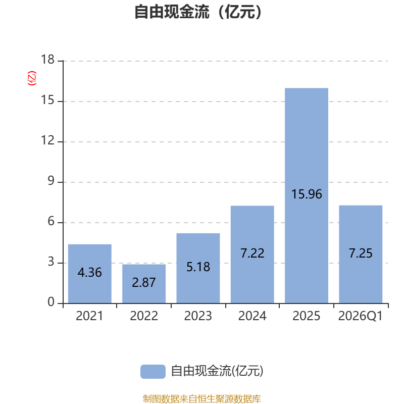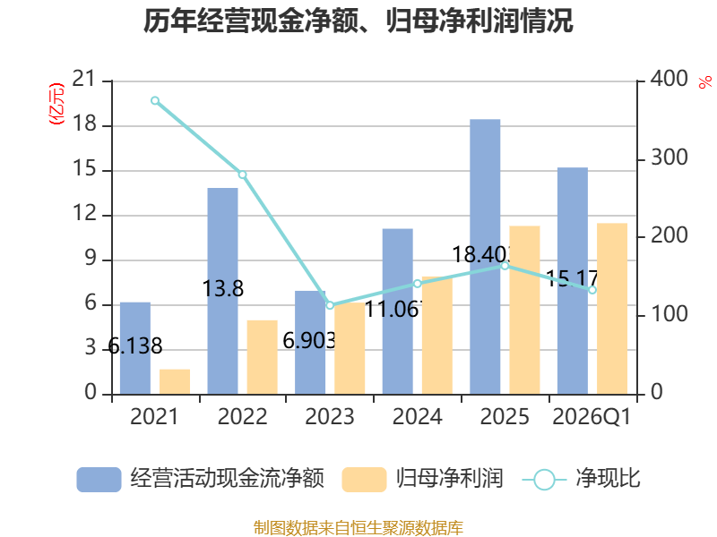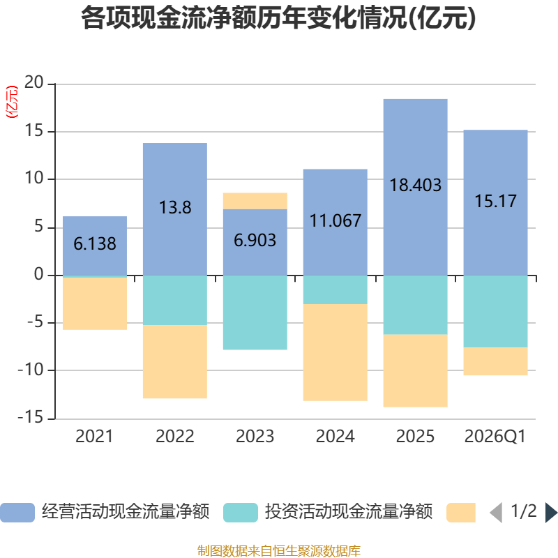 截至2026年一季度末,公司经营活动现金流净额为15.17亿元,同比增长152.73%;筹资活动现金流净额-2.91亿元,同比减少2.23亿元;投资活动现金流净额-7.58亿元,上年同期为6726.08万元。