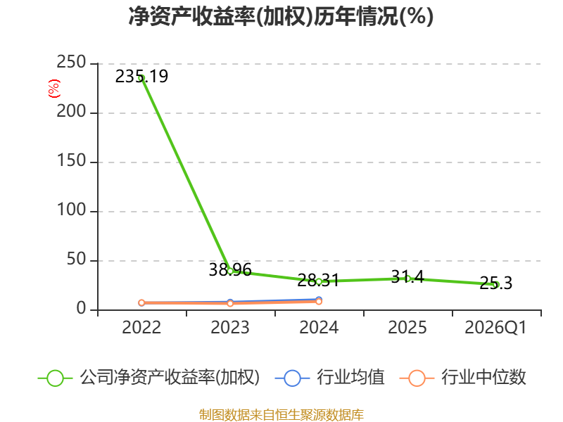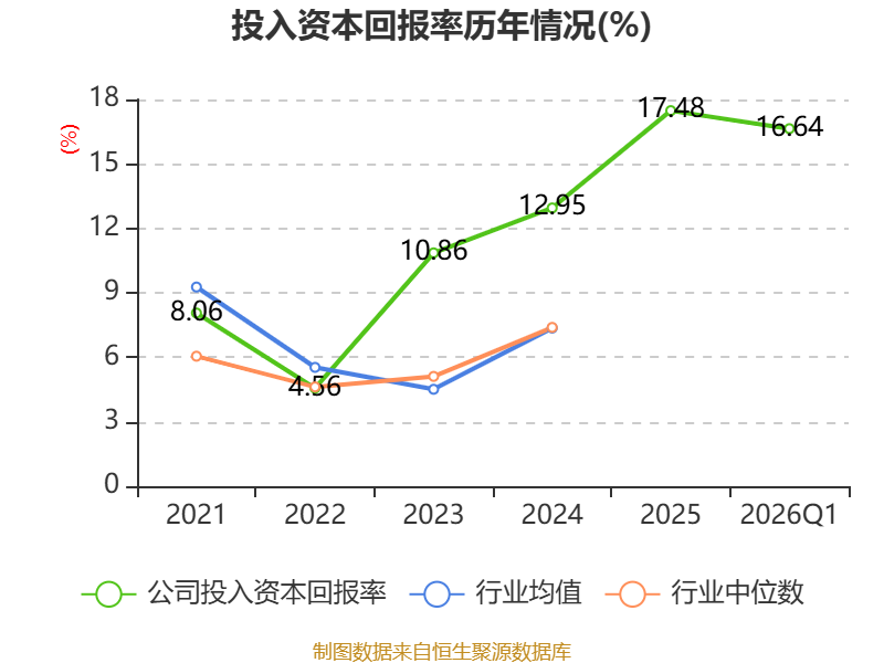 盈利能力方面, 2026年一季度公司加权平均净资产收益率为25.3%,同比上升16.6个百分点。公司2026年第一季度投入资本回报率为16.64%,较上年同期上升12.25个百分点。