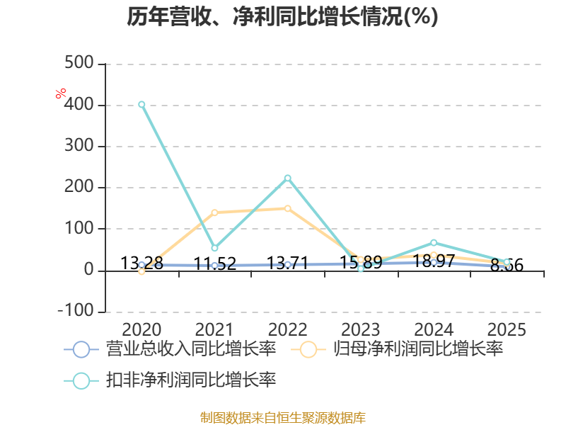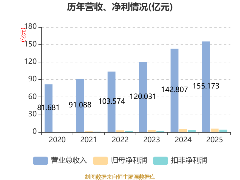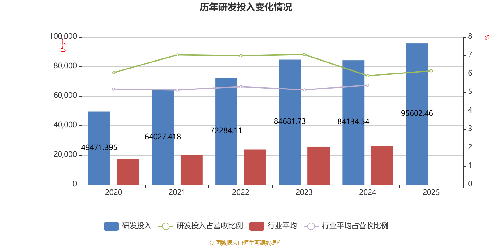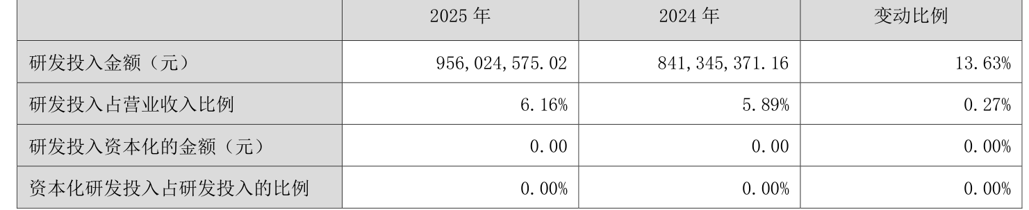 2025年全年,公司研发投入金额为9.56亿元,同比增长13.63%;研发投入占营业收入比例为6.16%,相比上年同期上升0.27个百分点。此外,公司全年研发投入资本化率为0%。