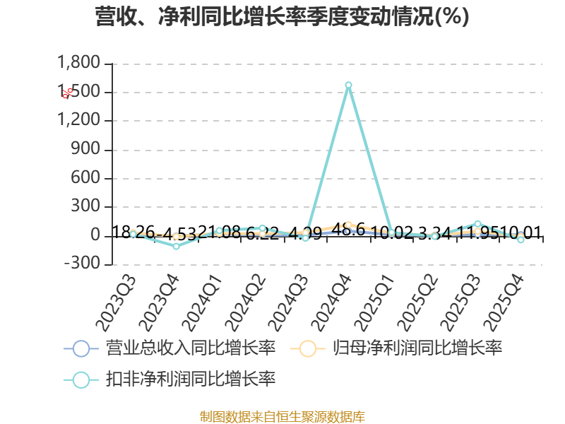 资产重大变化方面,截至2025年末,公司交易性金融资产合计较上年末减少100%,占公司总资产比重下降4个百分点;货币资金较上年末增加28.28%,占公司总资产比重上升2.52个百分点;应收票据及应收账款较上年末增加7.72%,占公司总资产比重上升1.53个百分点;固定资产较上年末减少0.97%,占公司总资产比重下降0.62个百分点。