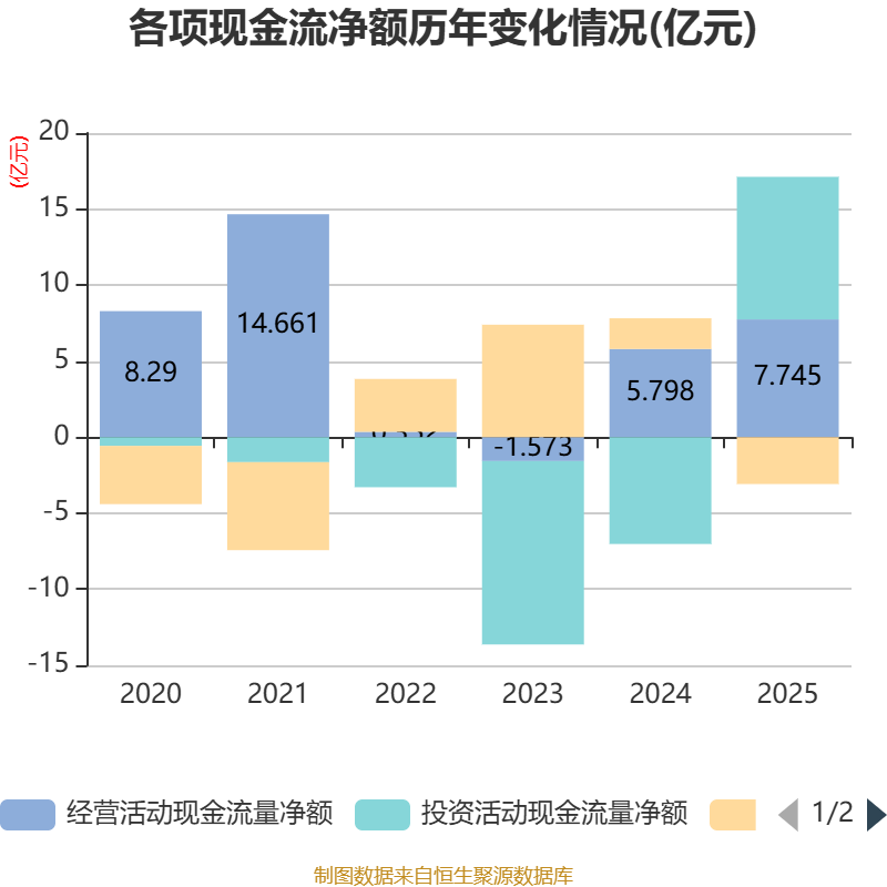 截至2025年,公司经营活动现金流净额为7.74亿元,同比增长33.58%;筹资活动现金流净额-3.08亿元,同比减少5.1亿元;投资活动现金流净额9.37亿元,上年同期为-7.02亿元。