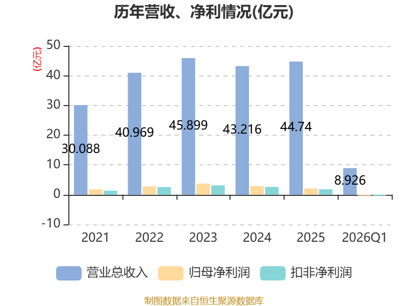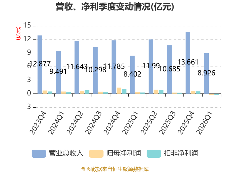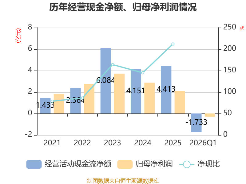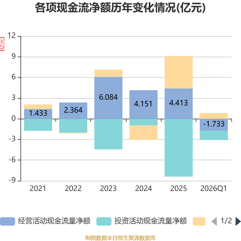 截至2026年一季度末,公司经营活动现金流净额为-1.73亿元,同比减少2.02亿元;筹资活动现金流净额8425.56万元,同比减少1095.33万元;投资活动现金流净额-1.35亿元,上年同期为-1.28亿元。