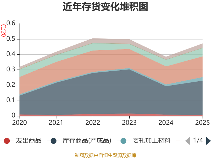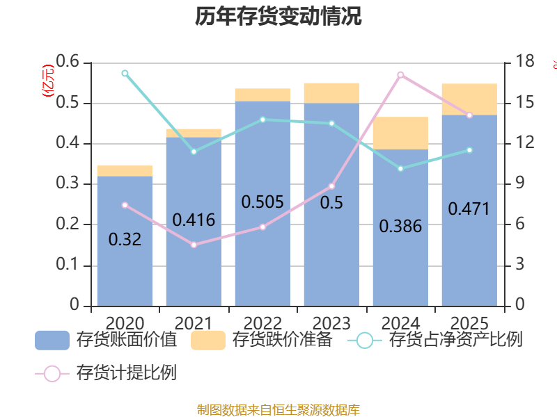 从存货变动来看,截至2025年末,公司存货账面价值为4711.18万元,占净资产的11.52%,较上年末增加849.03万元。其中,存货跌价准备为773.69万元,计提比例为14.11%。