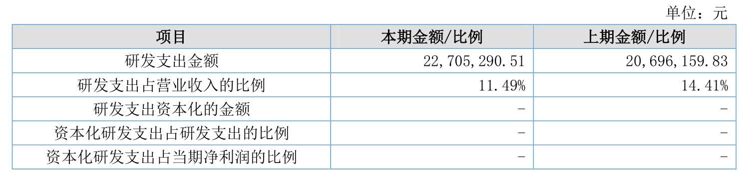 2025年全年,公司研发投入金额为2270.53万元,同比增长9.71%;研发投入占营业收入比例为11.49%,相比上年同期下降2.92个百分点。