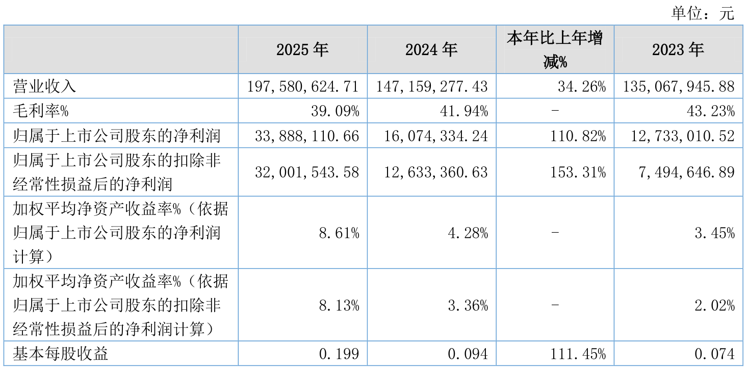 中证智能财讯星辰科技(920885)4月16日披露2025年年度报告。2025年,公司实现营业总收入1.98亿元,同比增长34.26%;归母净利润3388.81万元,同比增长110.82%;扣非净利润3200.15万元,同比增长153.31%;经营活动产生的现金流量净额为3701.59万元,同比增长22426.69%;报告期内,星辰科技基本每股收益为0.199元,加权平均净资产收益率为8.61%。公司2025年度分配预案为:拟向全体股东每10股派现0.6元(含税)。