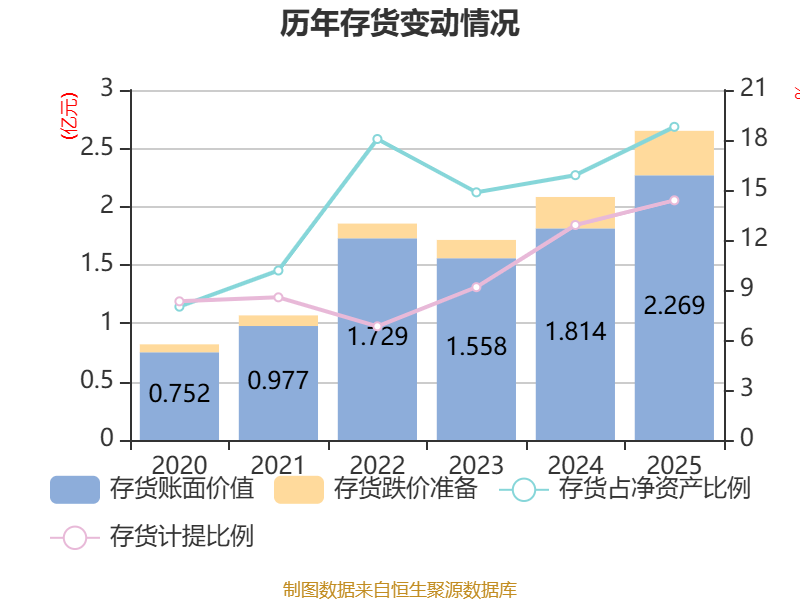 从存货变动来看,截至2025年末,公司存货账面价值为2.27亿元,占净资产的18.79%,较上年末增加4553.37万元。其中,存货跌价准备为3812.2万元,计提比例为14.38%。