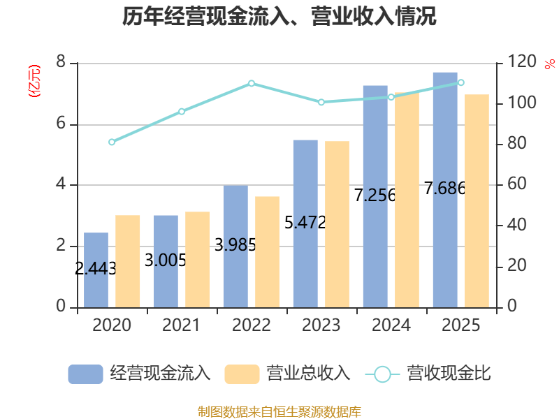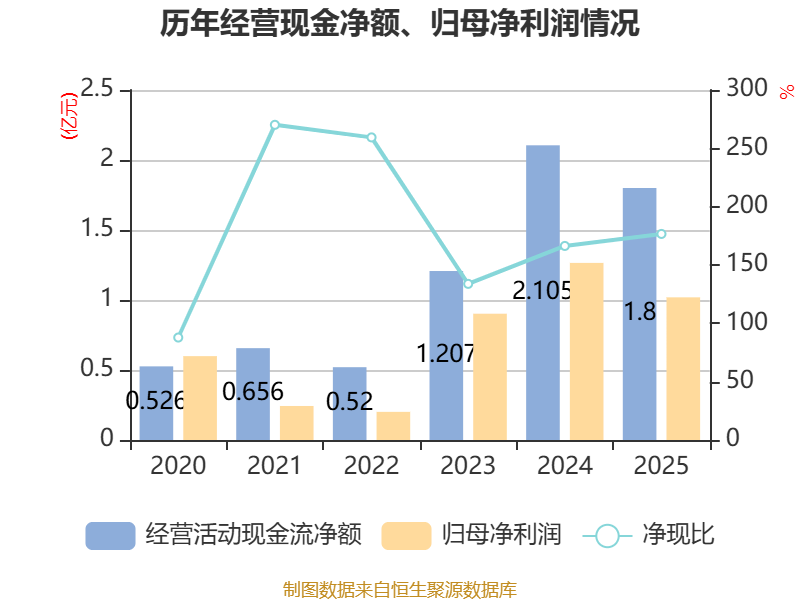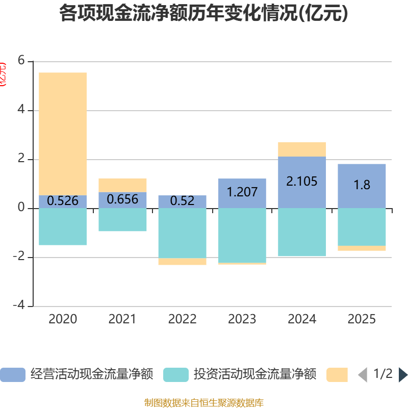 截至2025年,公司经营活动现金流净额为1.8亿元,同比下降14.46%;筹资活动现金流净额-2036.89万元,同比减少7890.99万元;投资活动现金流净额-1.54亿元,上年同期为-1.96亿元。