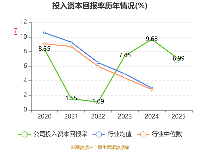 数据显示,2025年公司加权平均净资产收益率为8.77%,较上年同期下降2.87个百分点。公司2025年投入资本回报率为6.99%,较上年同期下降2.69个百分点。