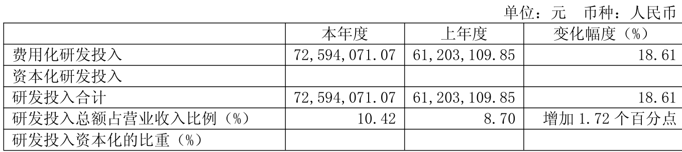 2025年全年,公司研发投入金额为7259.41万元,同比增长18.61%;研发投入占营业收入比例为10.42%,相比上年同期上升1.72个百分点。