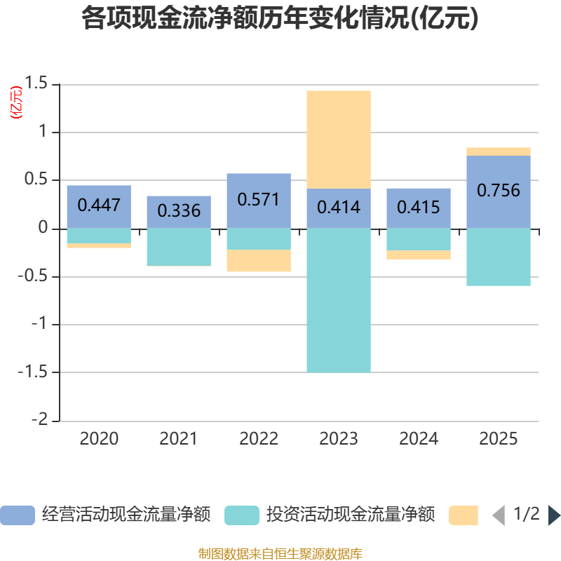 截至2025年,公司经营活动现金流净额为7556.55万元,同比增长82.25%;筹资活动现金流净额846.11万元,同比增加1780.8万元;投资活动现金流净额-5983.1万元,上年同期为-2299.19万元。