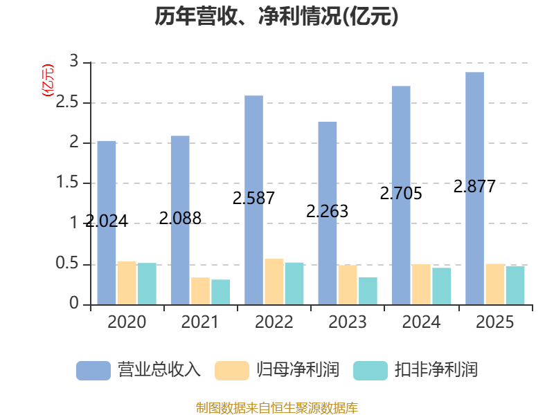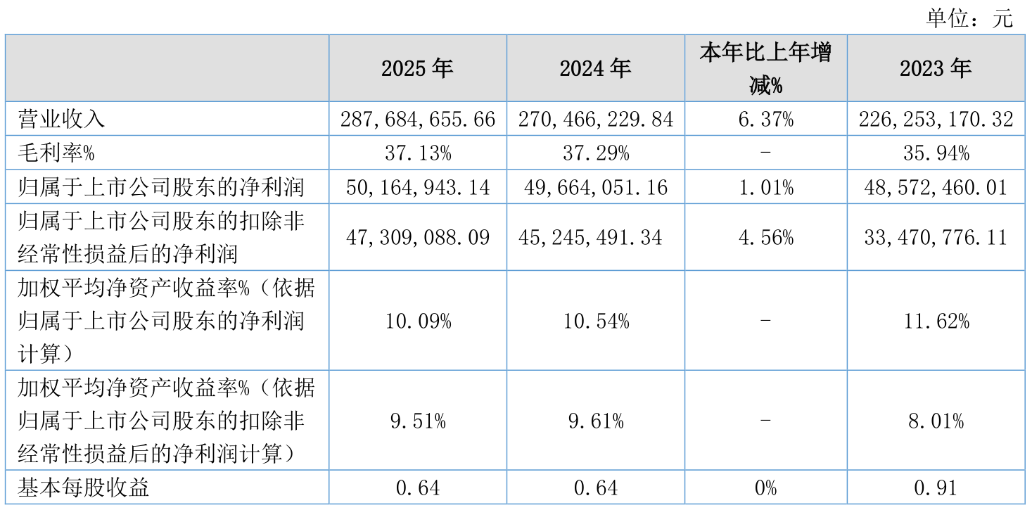 中证智能财讯峆一药业(920478)4月16日披露2025年年度报告。2025年,公司实现营业总收入2.88亿元,同比增长6.37%;归母净利润5016.49万元,同比增长1.01%;扣非净利润4730.91万元,同比增长4.56%;经营活动产生的现金流量净额为7556.55万元,同比增长82.25%;报告期内,峆一药业基本每股收益为0.64元,加权平均净资产收益率为10.09%。公司2025年度分配预案为:拟向全体股东每10股转4股,派现1.5元(含税)。