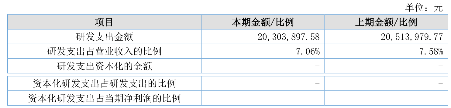 2025年全年,公司研发投入金额为2030.39万元,同比下降1.02%;研发投入占营业收入比例为7.06%,相比上年同期下降0.52个百分点。