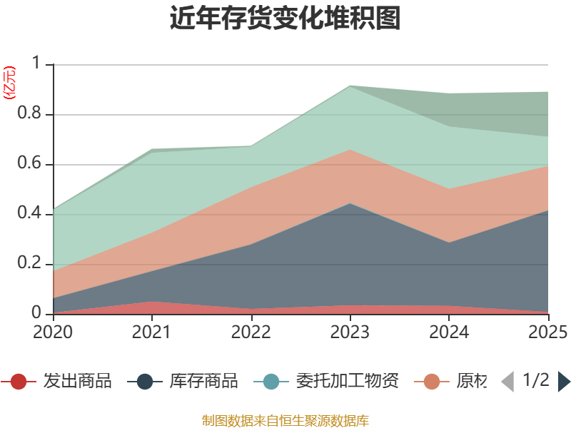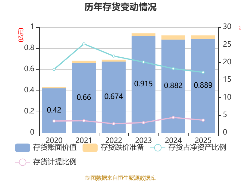 从存货变动来看,截至2025年末,公司存货账面价值为8894.37万元,占净资产的17.16%,较上年末增加71.42万元。其中,存货跌价准备为329.57万元,计提比例为3.57%。
