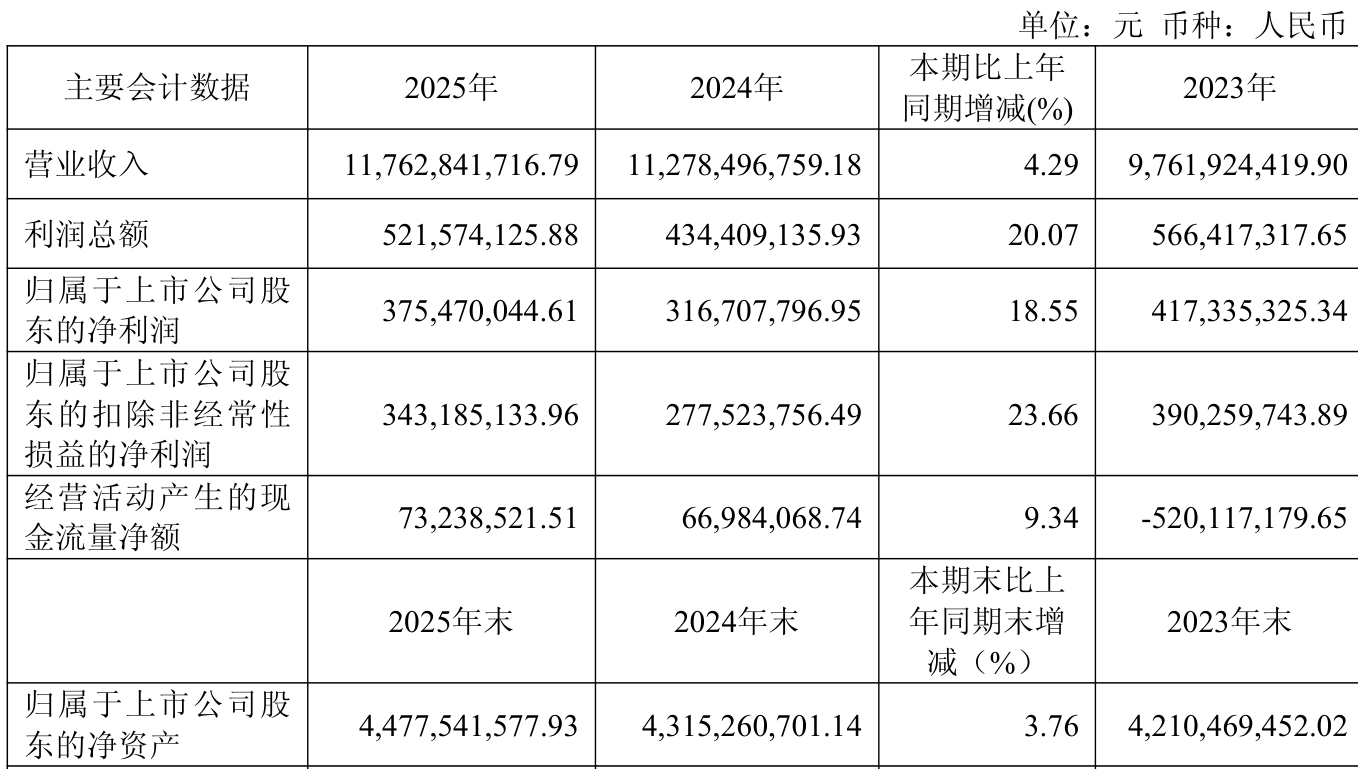 中证智能财讯福然德(605050)4月17日披露2025年年度报告。2025年,公司实现营业总收入117.63亿元,同比增长4.29%;归母净利润3.75亿元,同比增长18.55%;扣非净利润3.43亿元,同比增长23.66%;经营活动产生的现金流量净额为7323.85万元,同比增长9.34%;报告期内,福然德基本每股收益为0.76元,加权平均净资产收益率为8.62%。公司2025年度分配预案为:拟向全体股东每10股派现2元(含税)。