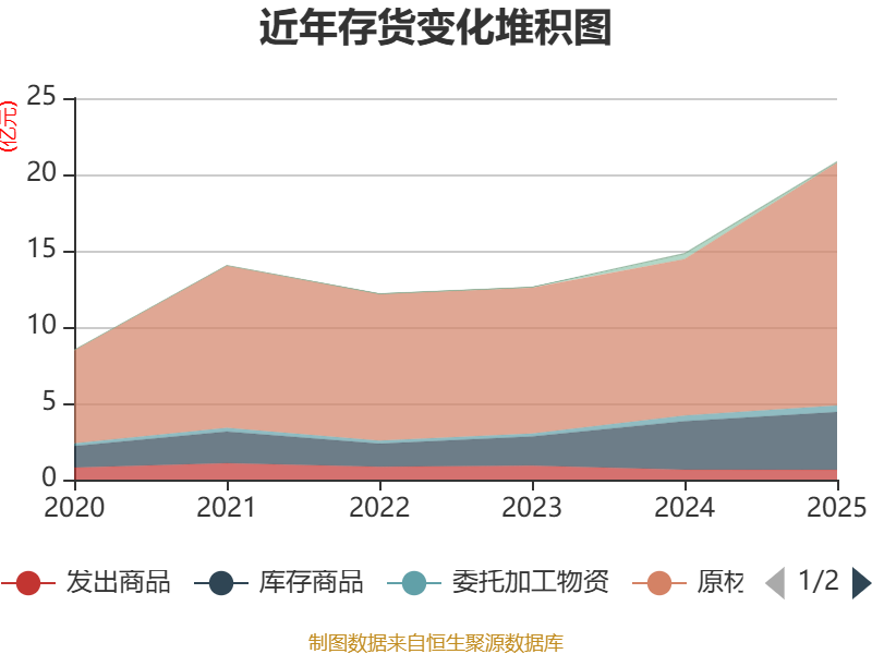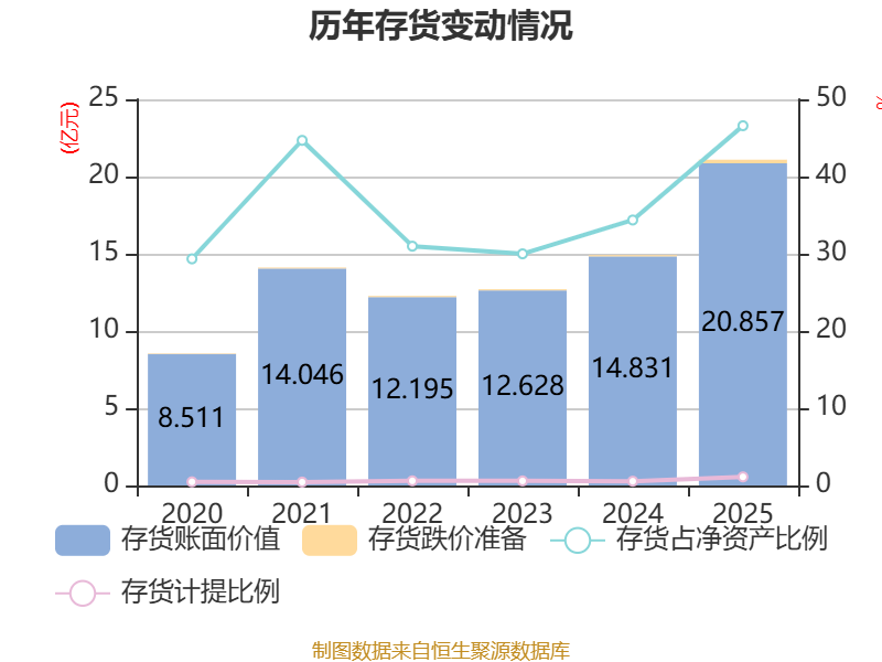 从存货变动来看,截至2025年末,公司存货账面价值为20.86亿元,占净资产的46.58%,较上年末增加6.03亿元。其中,存货跌价准备为2335.91万元,计提比例为1.11%。