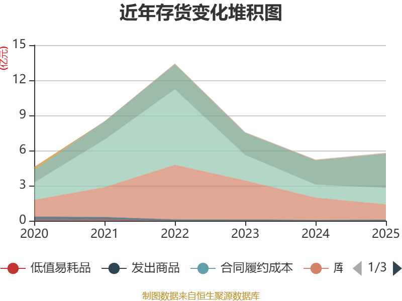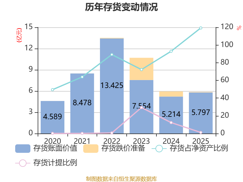 从存货变动来看,截至2025年末,公司存货账面价值为5.8亿元,占净资产的119.25%,较上年末增加5830.85万元。其中,存货跌价准备为661.23万元,计提比例为1.13%。