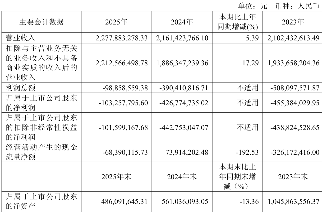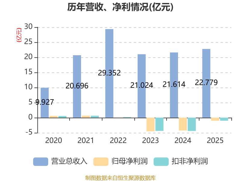 中证智能财讯芳源股份(688148)4月17日披露2025年年度报告。2025年,公司实现营业总收入22.78亿元,同比增长5.39%;归母净利润亏损1.03亿元,上年同期亏损4.27亿元;扣非净利润亏损1.02亿元,上年同期亏损4.43亿元;经营活动产生的现金流量净额为-6839.01万元,上年同期为7391.42万元;报告期内,芳源股份基本每股收益为-0.21元,加权平均净资产收益率为-20.18%。