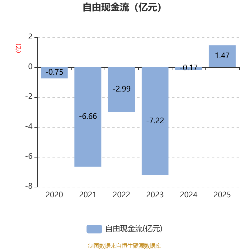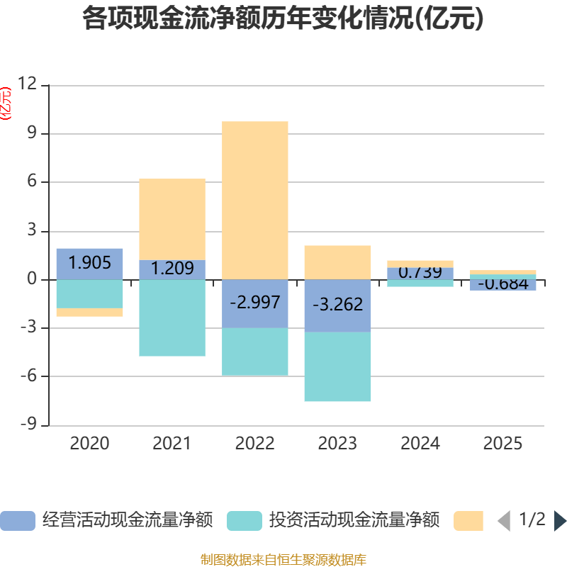 截至2025年,公司经营活动现金流净额为-6839.01万元,同比减少1.42亿元;筹资活动现金流净额2619.61万元,同比减少1644.04万元;投资活动现金流净额3152.77万元,上年同期为-4475.23万元。