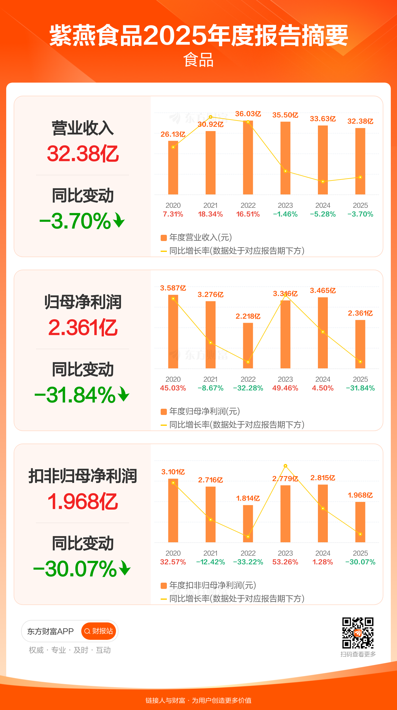 图解财报:紫燕食品全年归母净利润2.36亿元,同比减少31.84%