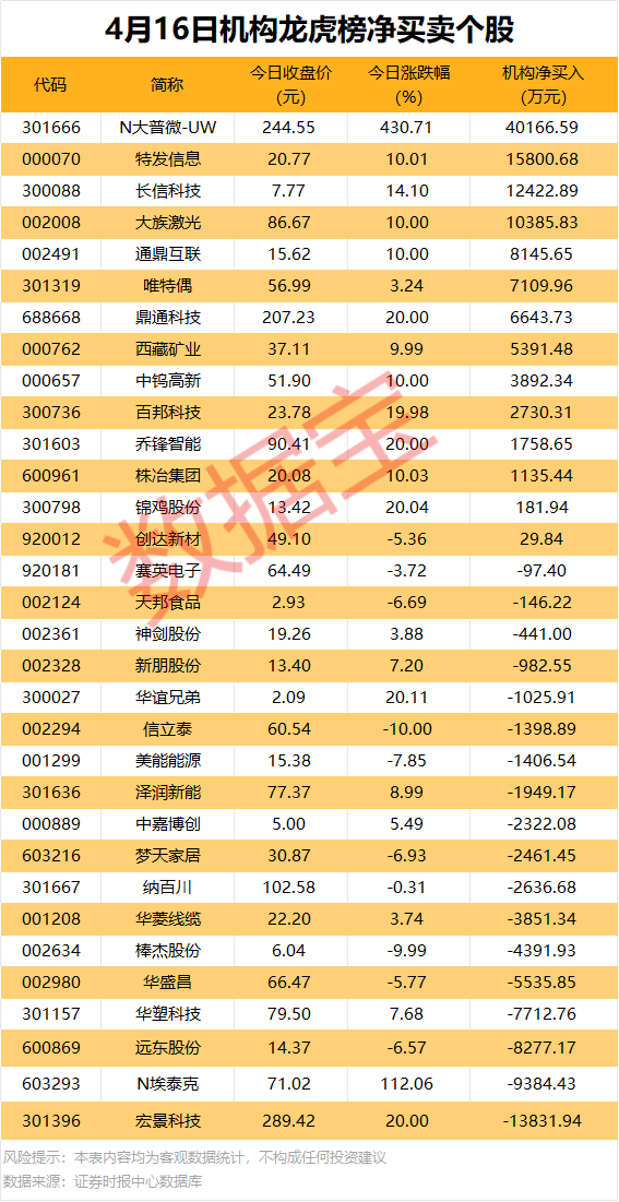 今日龙虎榜中,机构净买入的个股为14只;净卖出的个股为18只。机构净买入8股均超5000万元,N大普微-UW获机构净买入4.02亿元,居首;其次是特发信息、长信科技等,机构净买入金额均超1亿元。