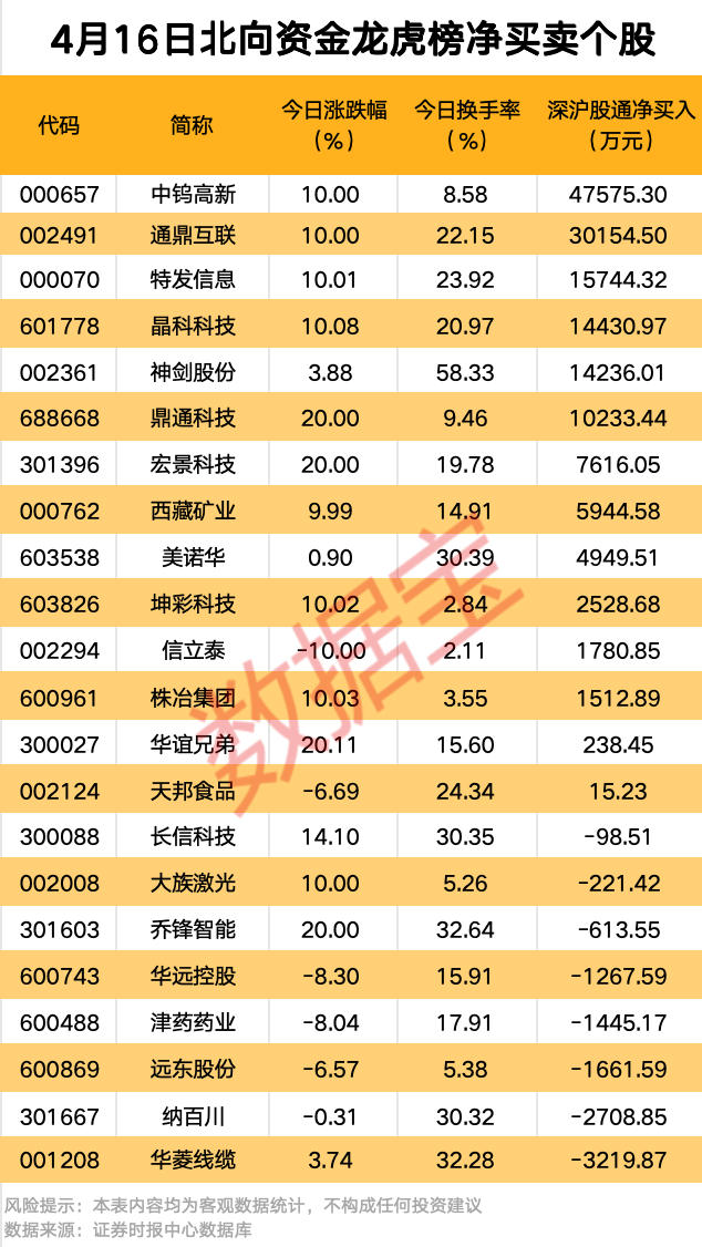 今日龙虎榜现身个股中,22股获北向资金净买入。北向资金净买入居首的是中钨高新,金额为4.76亿元;通鼎互联、特发信息和晶科科技等均获净买入超1.4亿元。