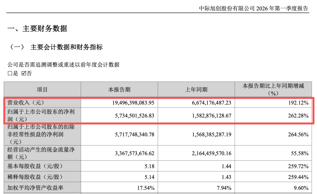 4月16日晚,中际旭创(300308)披露一季报显示,2026年第一季度,公司实现营业收入194.96亿元,同比增长192.12%,实现净利润57.35亿元,同比增长262.28%,经营活动现金流净额同比增长55.58%,基本每股收益5.18元。