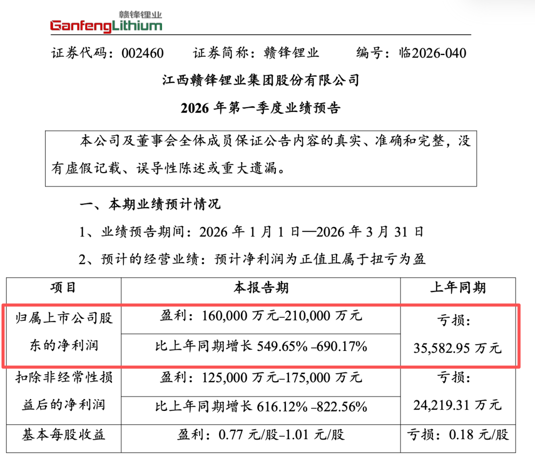 4月16日晚,赣锋锂业(002460)披露业绩预告,预计2026年一季度净利润16亿元—21亿元,上年同期亏损3.56亿元,基本每股收益0.77 元/股—1.01 元/股,上年同期亏损0.18 元/股。
