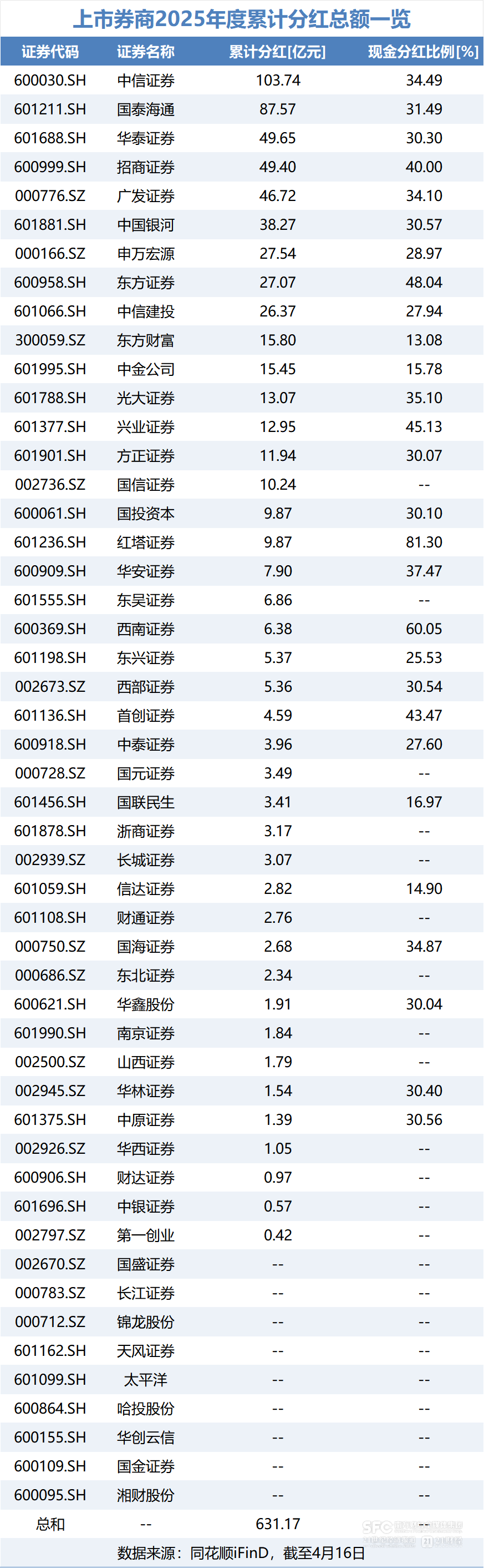 同花顺iFinD数据显示,截至4月16日,2025年全年券商板块累计分红总额达631.17亿元,已经超过2024全年之和553.98亿元,创下近年分红规模新高。