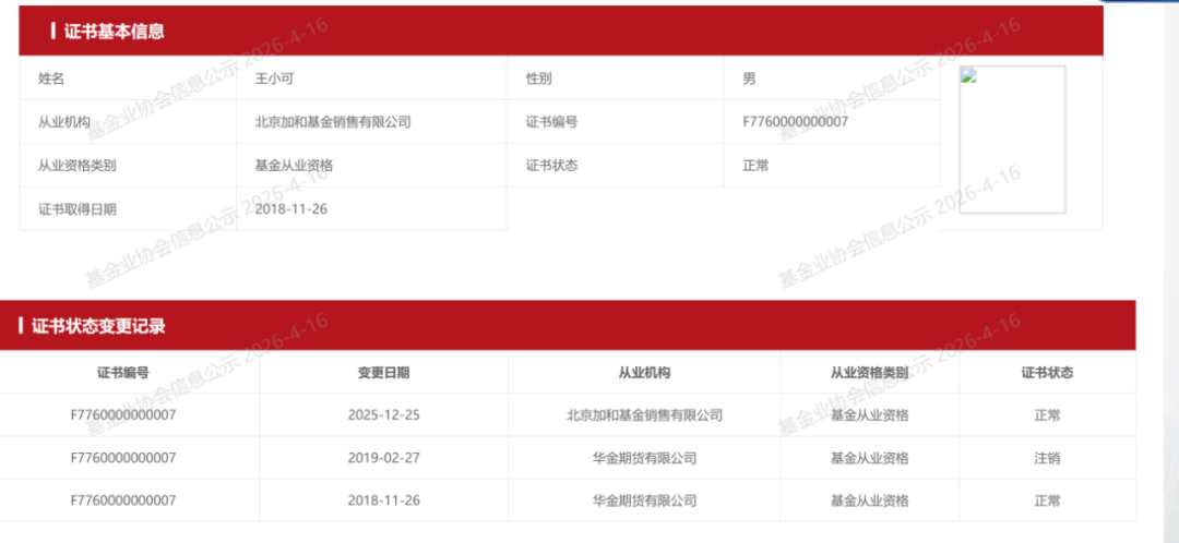 洪灏并非个例。基金业协会“证书状态变更记录”显示,同为“财经大V”的王小可的基金从业经历在2025年12月25日更新,其从业机构也登记为北京加和基金销售有限公司。
