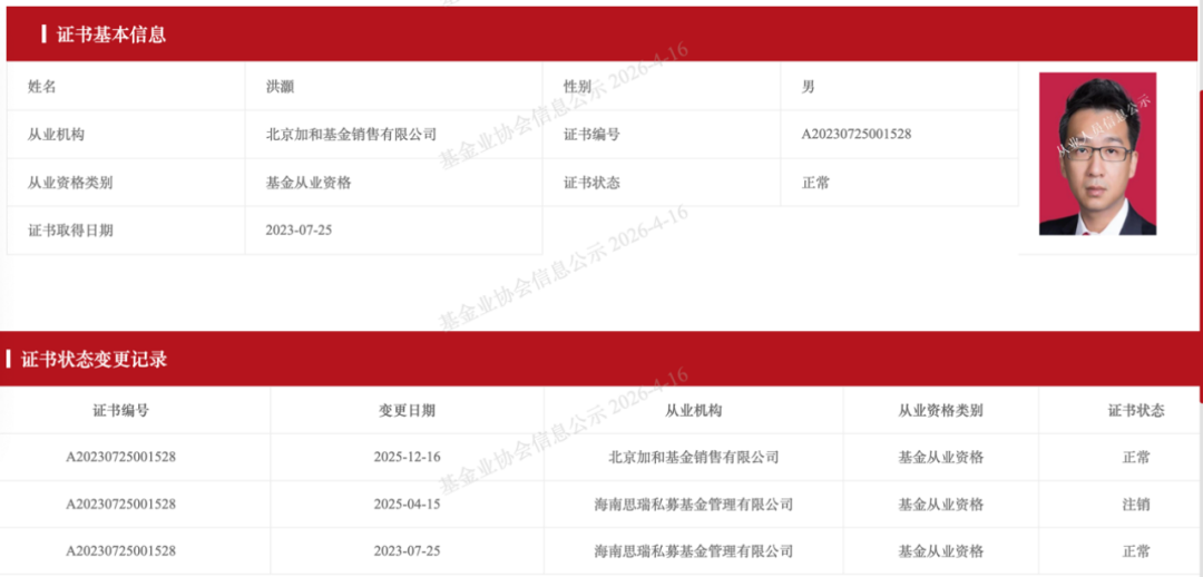 基金业协会的“证书状态变更记录”显示,洪灏的基金从业生涯始于2023年7月25日,当时他在海南思瑞私募基金管理有限公司任职,这也是他取得基金从业资格证书的初始机构,2025年4月15日其基金从业资格注销。到2025年12月16日,其从业机构已登记为北京加和基金销售有限公司。