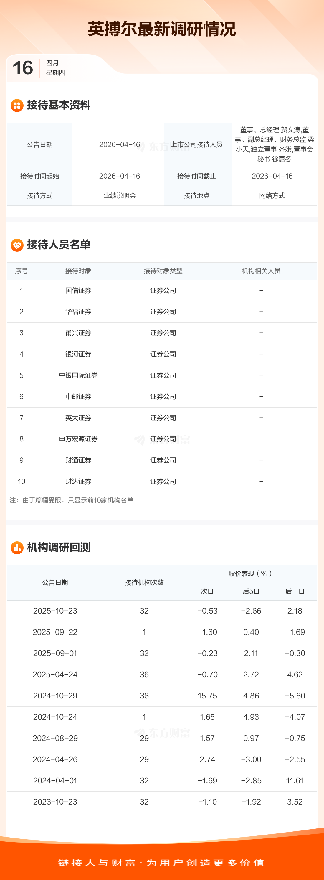 英搏尔4月16日公告称,4月16日接待国信证券等35家机构调研。接待人员包括董事、总经理 贺文涛,董事、副总经理、财务总监 梁小天,独立董事 齐娥,董事会秘书 徐惠冬。