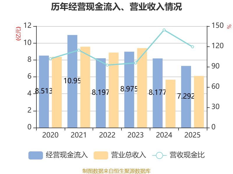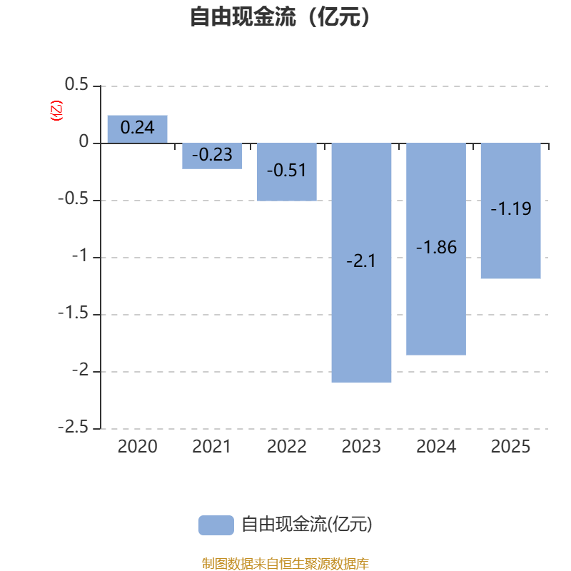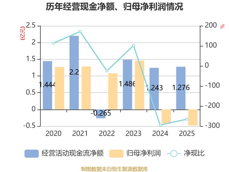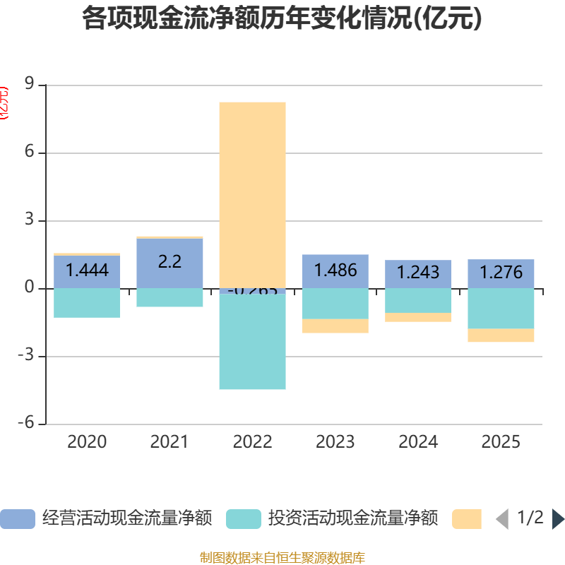 截至2025年,公司经营活动现金流净额为1.28亿元,同比增长2.61%;筹资活动现金流净额-5805.94万元,同比减少1823.39万元;投资活动现金流净额-1.8亿元,上年同期为-1.09亿元。