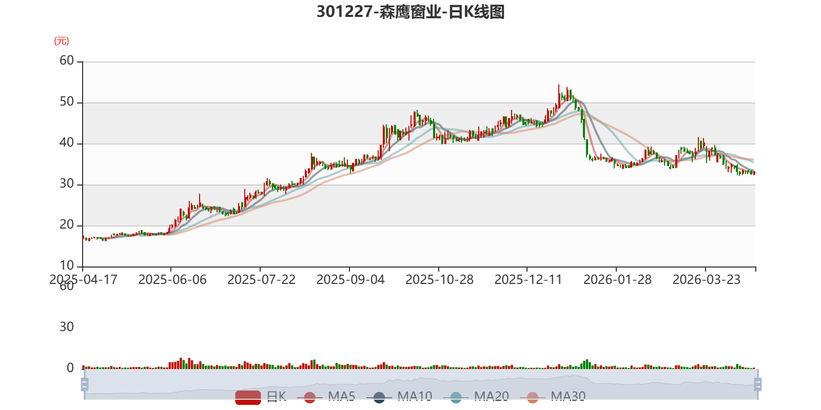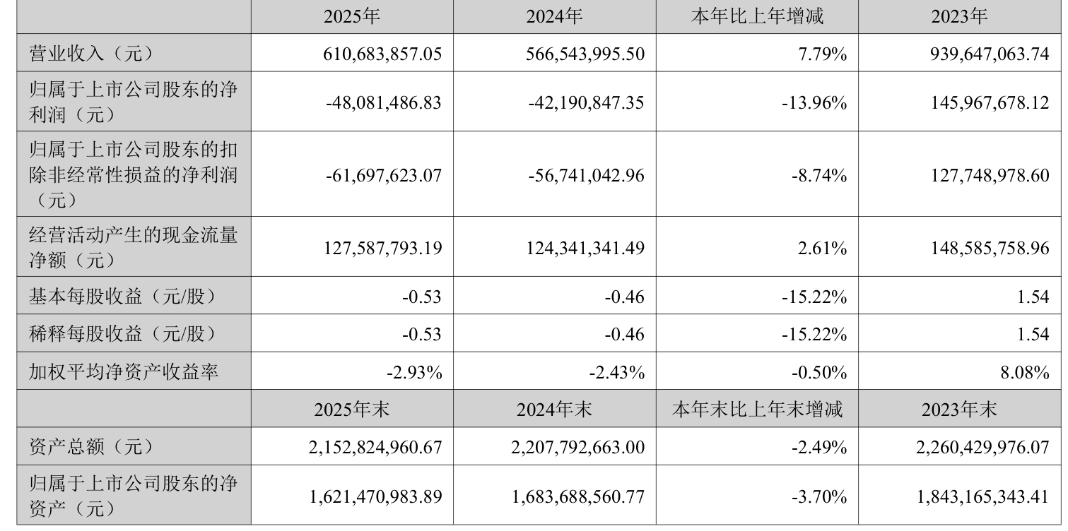 中证智能财讯森鹰窗业(301227)4月17日披露2025年年度报告。2025年,公司实现营业总收入6.11亿元,同比增长7.79%;归母净利润亏损4808.15万元,上年同期亏损4219.08万元;扣非净利润亏损6169.76万元,上年同期亏损5674.1万元;经营活动产生的现金流量净额为1.28亿元,同比增长2.61%;报告期内,森鹰窗业基本每股收益为-0.53元,加权平均净资产收益率为-2.93%。公司2025年度分配预案为:拟向全体股东每10股转4股。