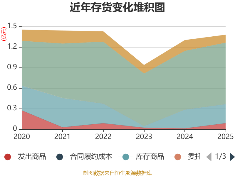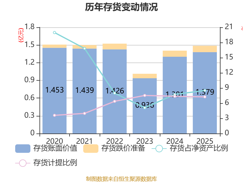 从存货变动来看,截至2025年末,公司存货账面价值为1.38亿元,占净资产的8.5%,较上年末增加779.78万元。其中,存货跌价准备为1076.74万元,计提比例为7.24%。