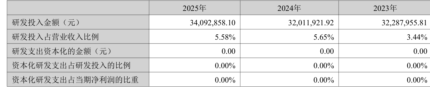 2025年全年,公司研发投入金额为3409.29万元,同比增长6.5%;研发投入占营业收入比例为5.58%,相比上年同期下降0.07个百分点。此外,公司全年研发投入资本化率为0%。