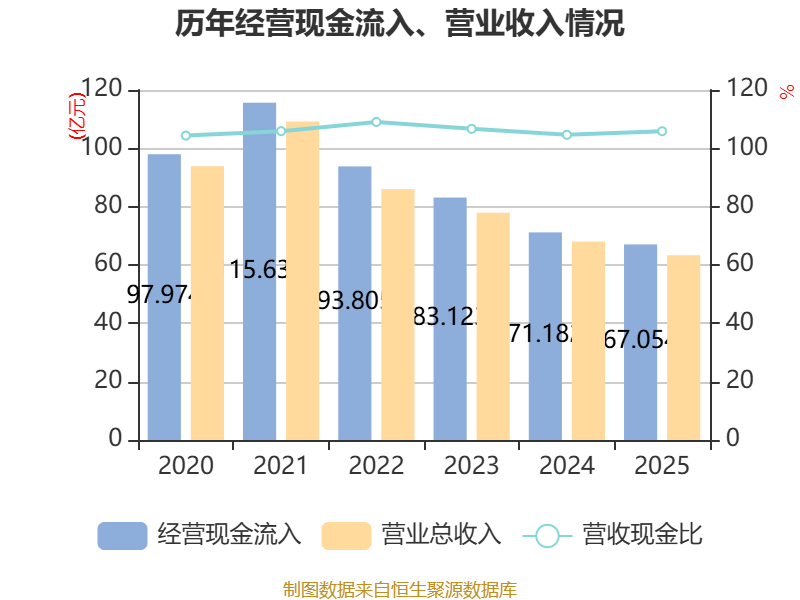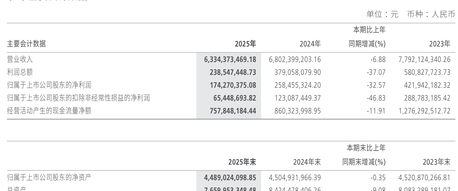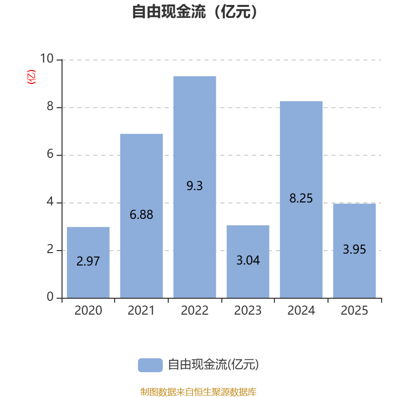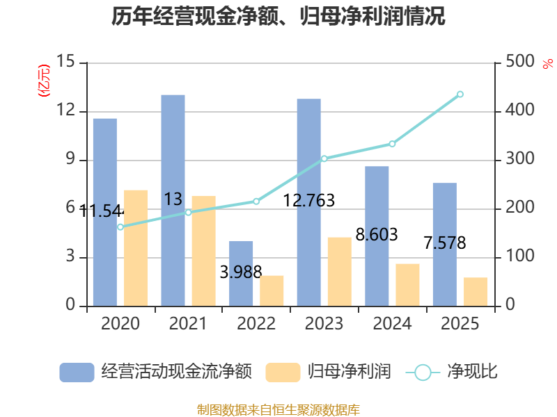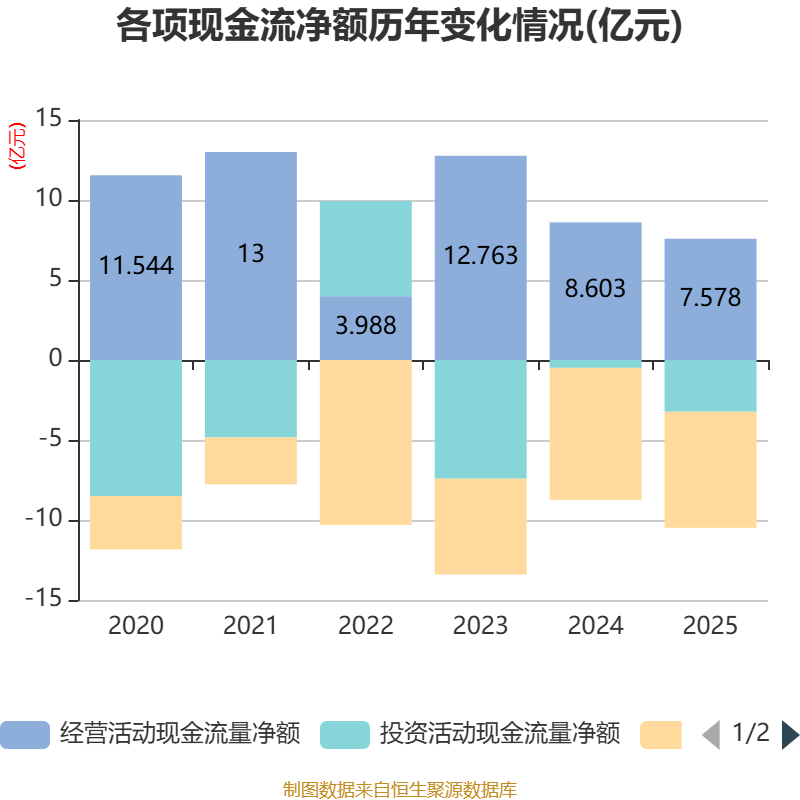 截至2025年,公司经营活动现金流净额为7.58亿元,同比下降11.91%;筹资活动现金流净额-7.26亿元,同比增加9896.25万元;投资活动现金流净额-3.23亿元,上年同期为-4906.34万元。