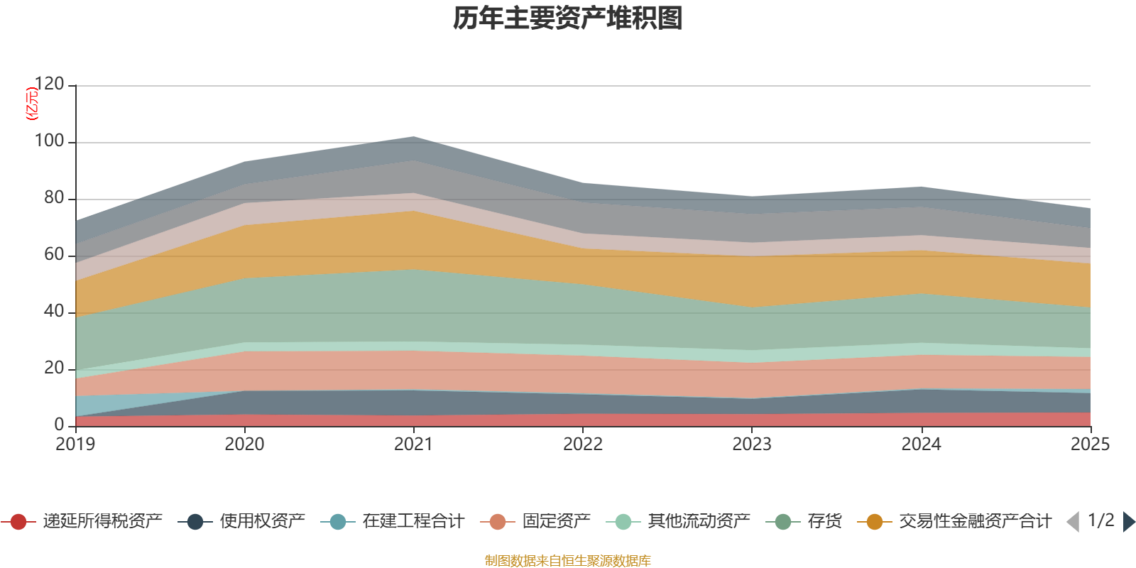 资产重大变化方面,截至2025年末,公司货币资金较上年末减少29.47%,占公司总资产比重下降2.64个百分点;交易性金融资产合计较上年末增加1.52%,占公司总资产比重上升2.11个百分点;存货较上年末减少17.3%,占公司总资产比重下降1.86个百分点;在建工程合计较上年末增加278.94%,占公司总资产比重上升1.44个百分点。