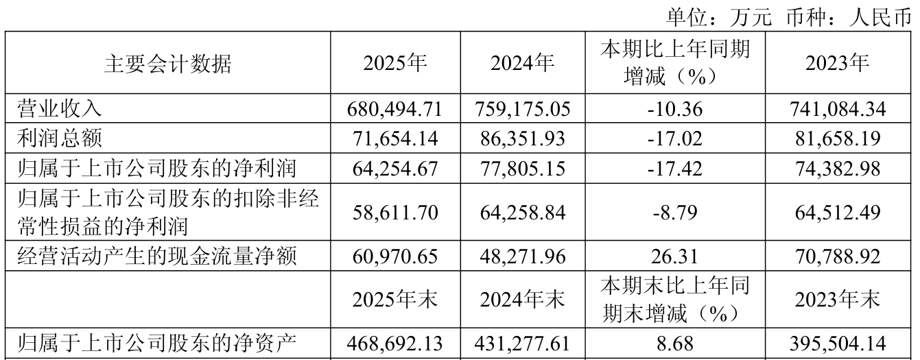 中证智能财讯川仪股份(603100)4月17日披露2025年年度报告。2025年,公司实现营业总收入68.05亿元,同比下降10.36%;归母净利润6.43亿元,同比下降17.42%;扣非净利润5.86亿元,同比下降8.79%;经营活动产生的现金流量净额为6.1亿元,同比增长26.31%;报告期内,川仪股份基本每股收益为1.26元,加权平均净资产收益率为14.13%。公司2025年度分配预案为:拟向全体股东每10股派现2.1元(含税)。