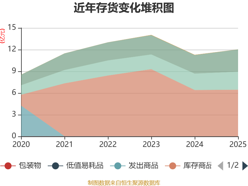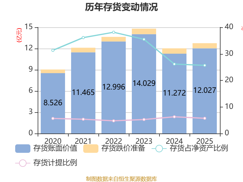 从存货变动来看,截至2025年末,公司存货账面价值为12.03亿元,占净资产的25.66%,较上年末增加7546.99万元。其中,存货跌价准备为7290.59万元,计提比例为5.72%。