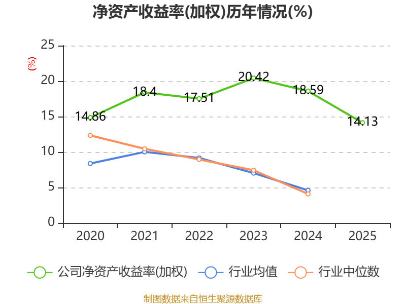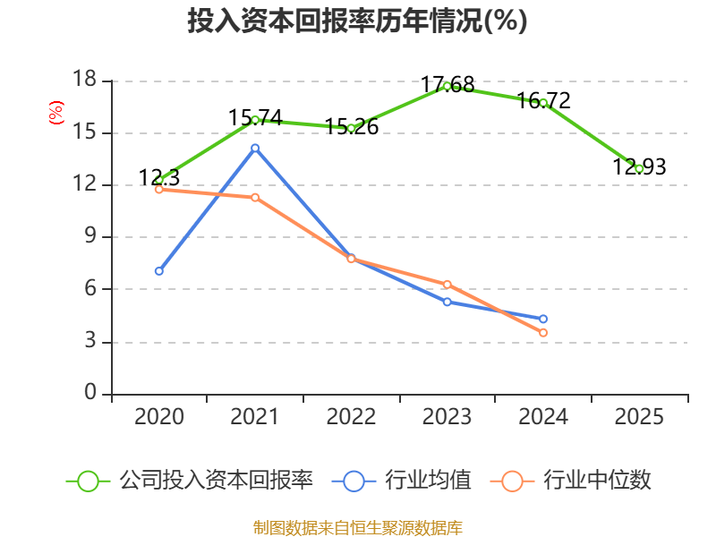 数据显示,2025年公司加权平均净资产收益率为14.13%,较上年同期下降4.46个百分点。公司2025年投入资本回报率为12.93%,较上年同期下降3.79个百分点。
